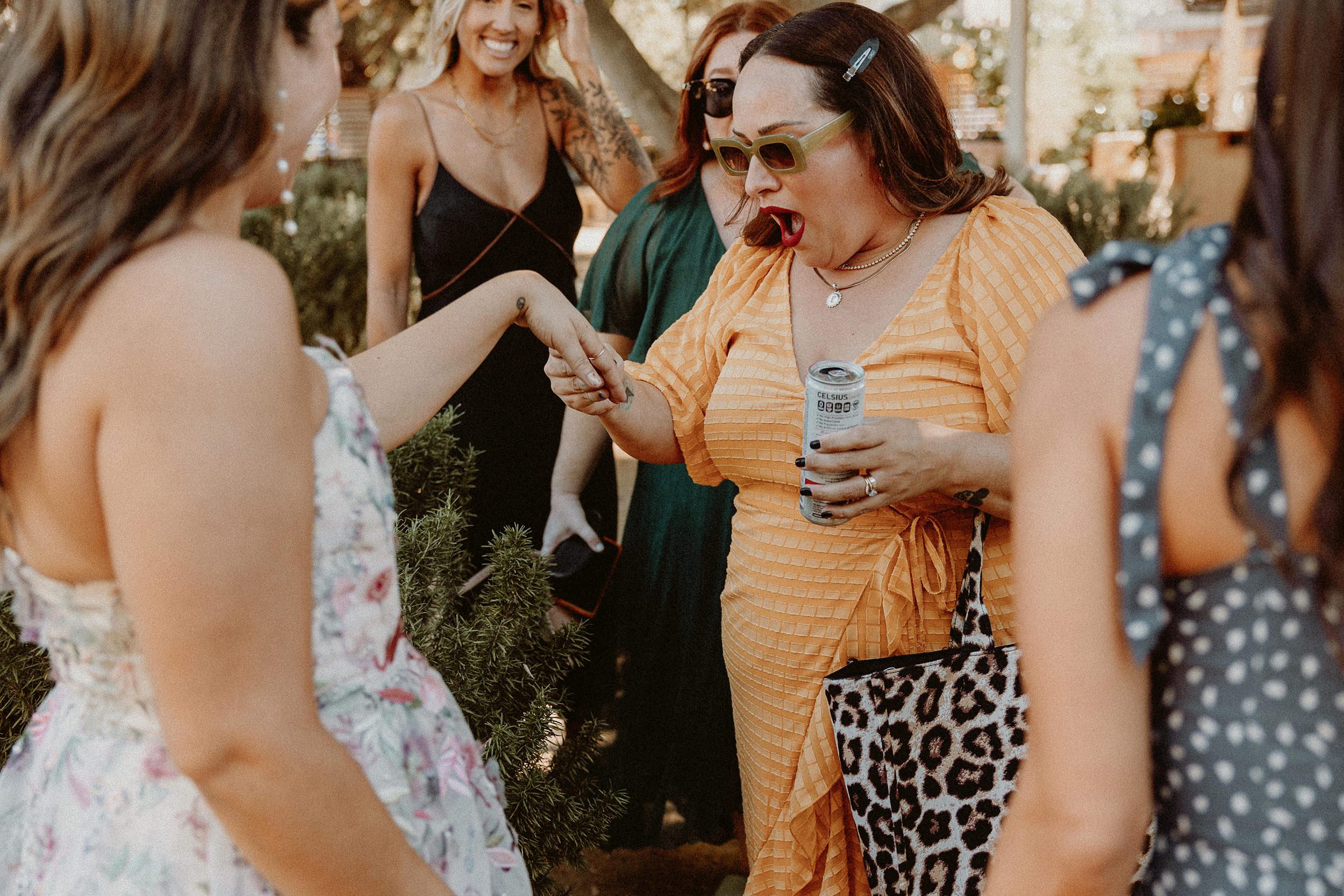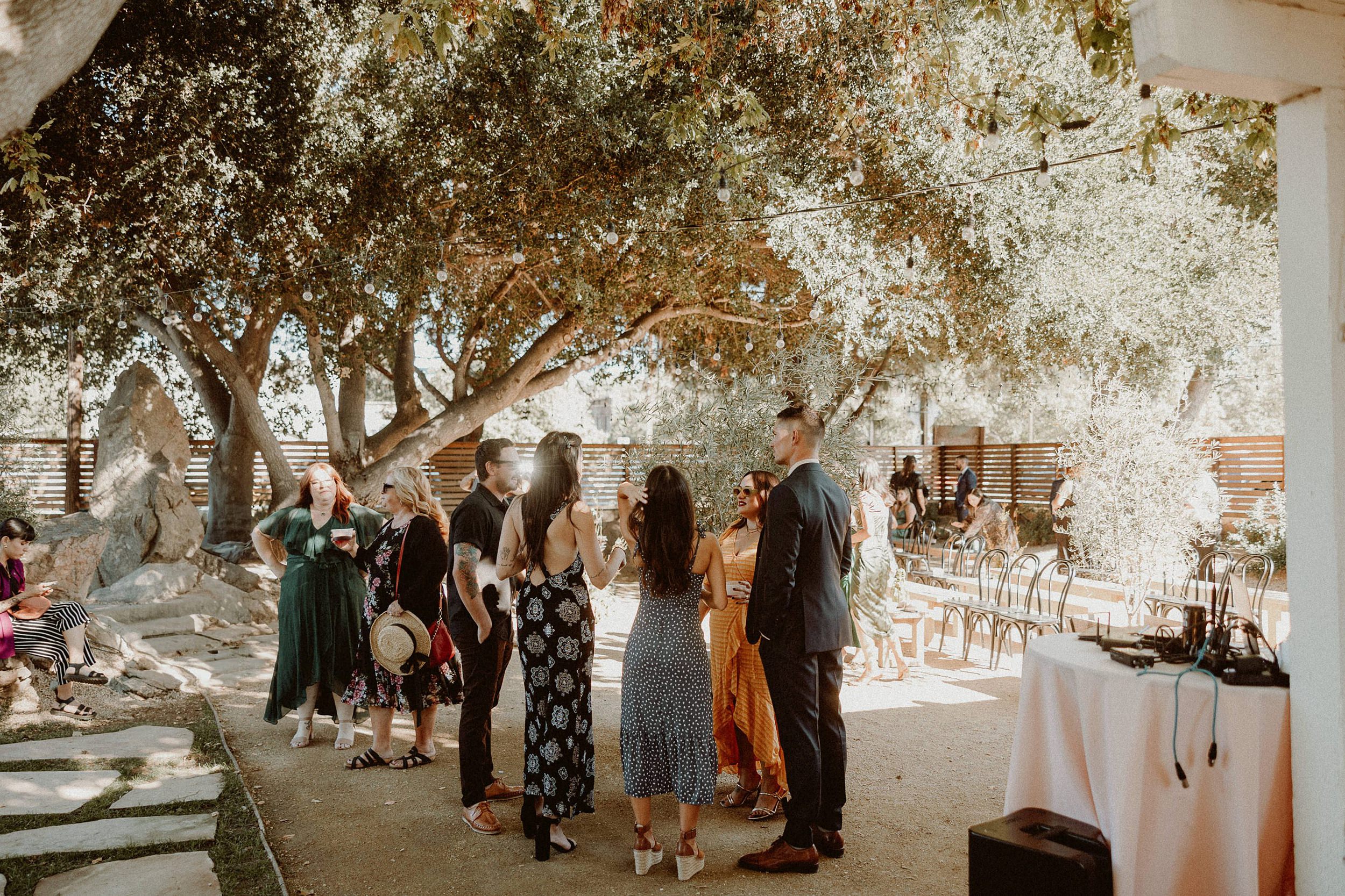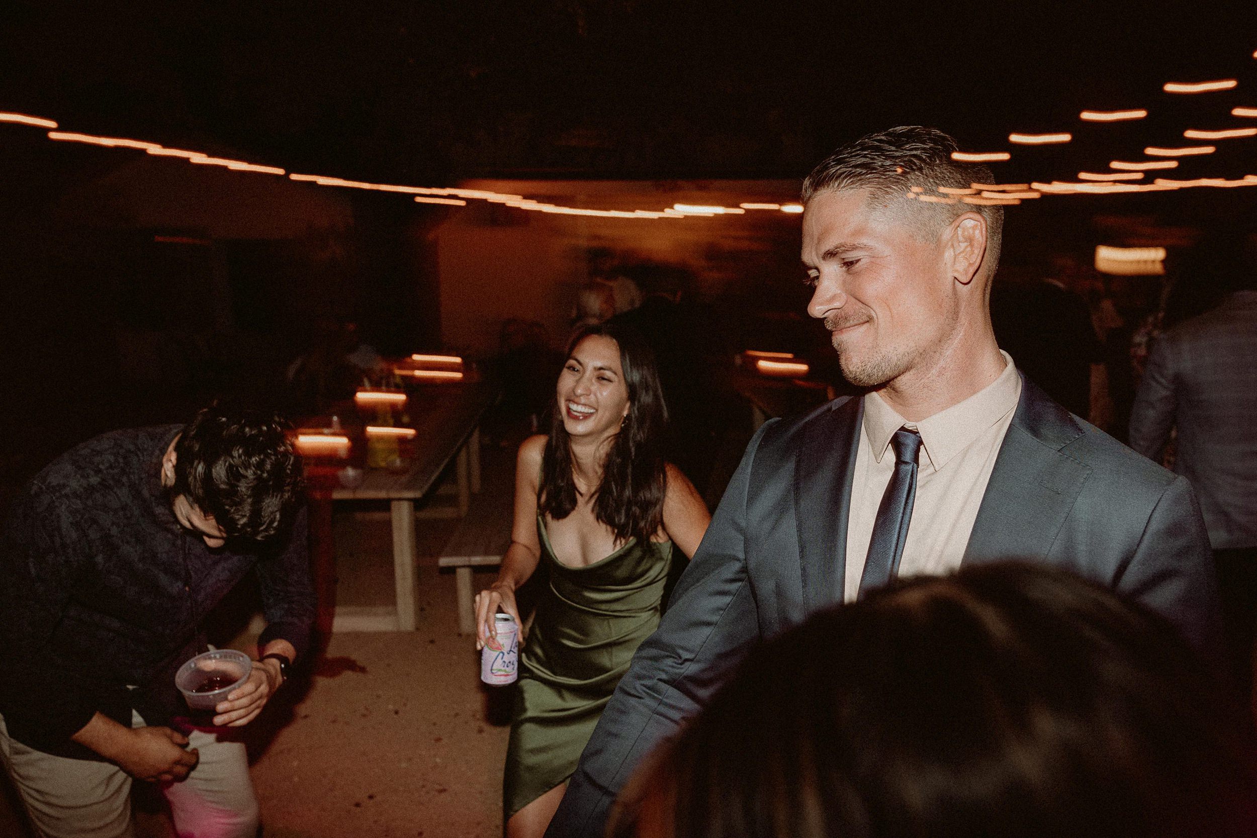 Their celebration at Bodega in Los Alamos felt like an elevated backyard hangout—no seating chart, picnic tables under the trees, and friends mingling freely. It was effortlessly welcoming, with a come-as-you-are spirit that invited connection and conversation. The details reflected them perfectly. There was an eclectic mix of greenery, produce, and potted plants that let the natural beauty of the space do the talking. Plus, Liz wore an awesome colorful wedding dress that matched her vibrant energy perfectly.