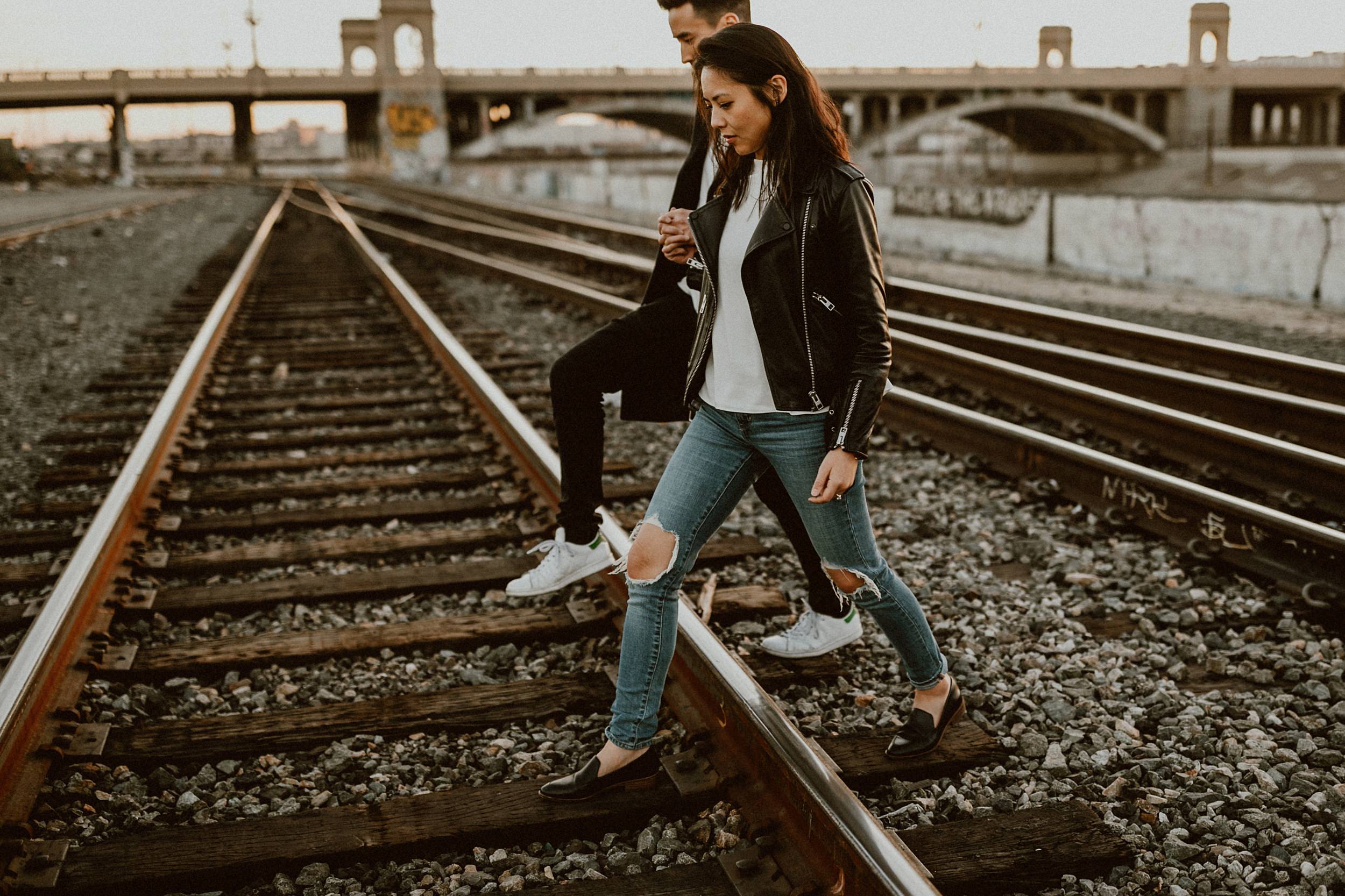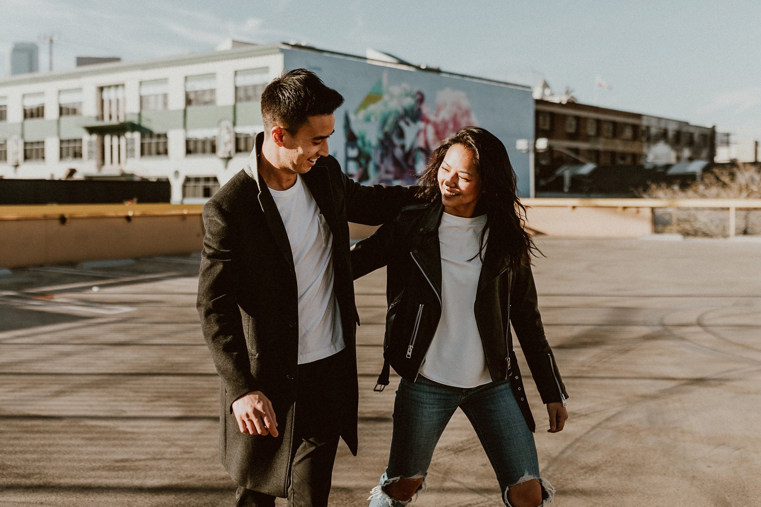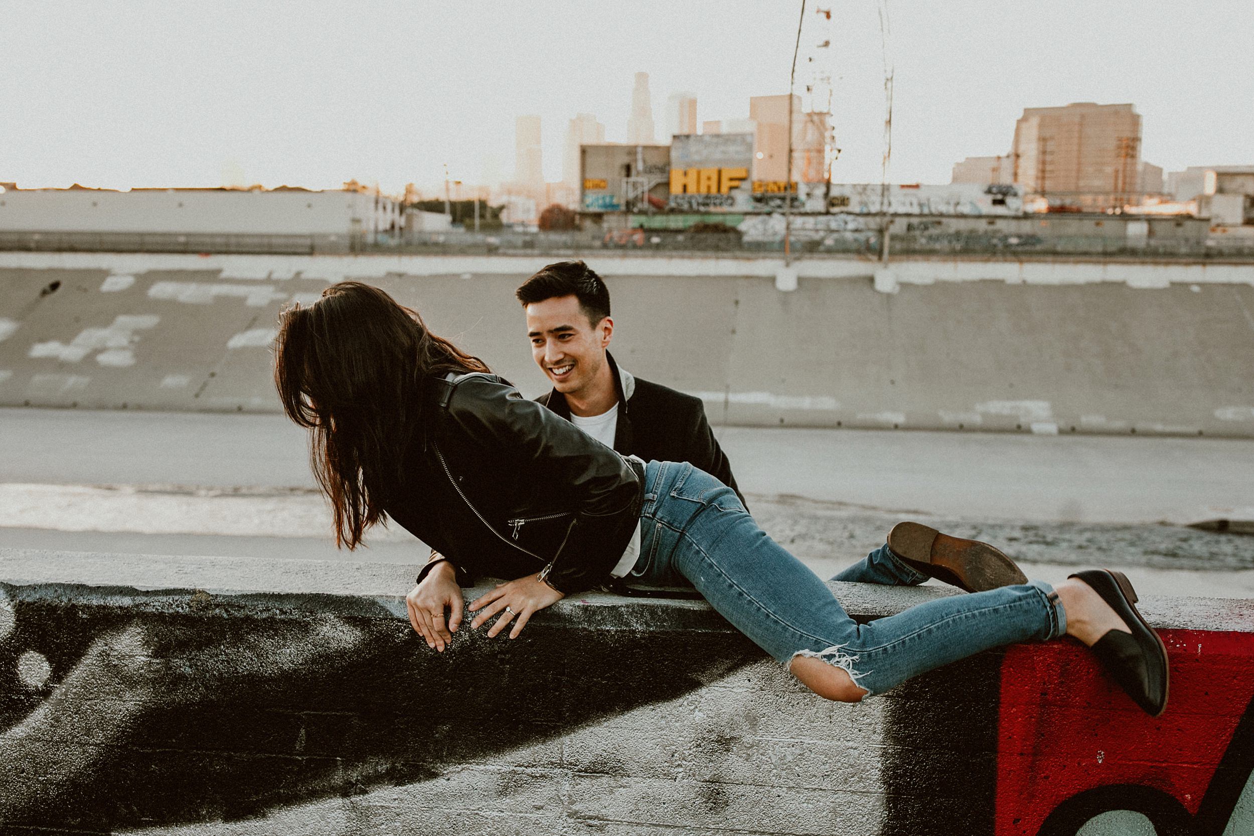 Los Angeles Arts District Couples Photos // We met up with Joanne & George on a rooftop in the middle of Los Angeles. Our game plan was basically to have a playdate on foot throughout the Art’s District. In route, we were seeking all things that give the area character… color and grit, light, architecture, and skylines. Of course, having a couple of babes leading the charge was a little extra something to devour. We were eating up all of Joanne + George’s sweetness the entire time. The endgame? Spilling out into the LA River at sunset. The perfect ending to our little playdate.