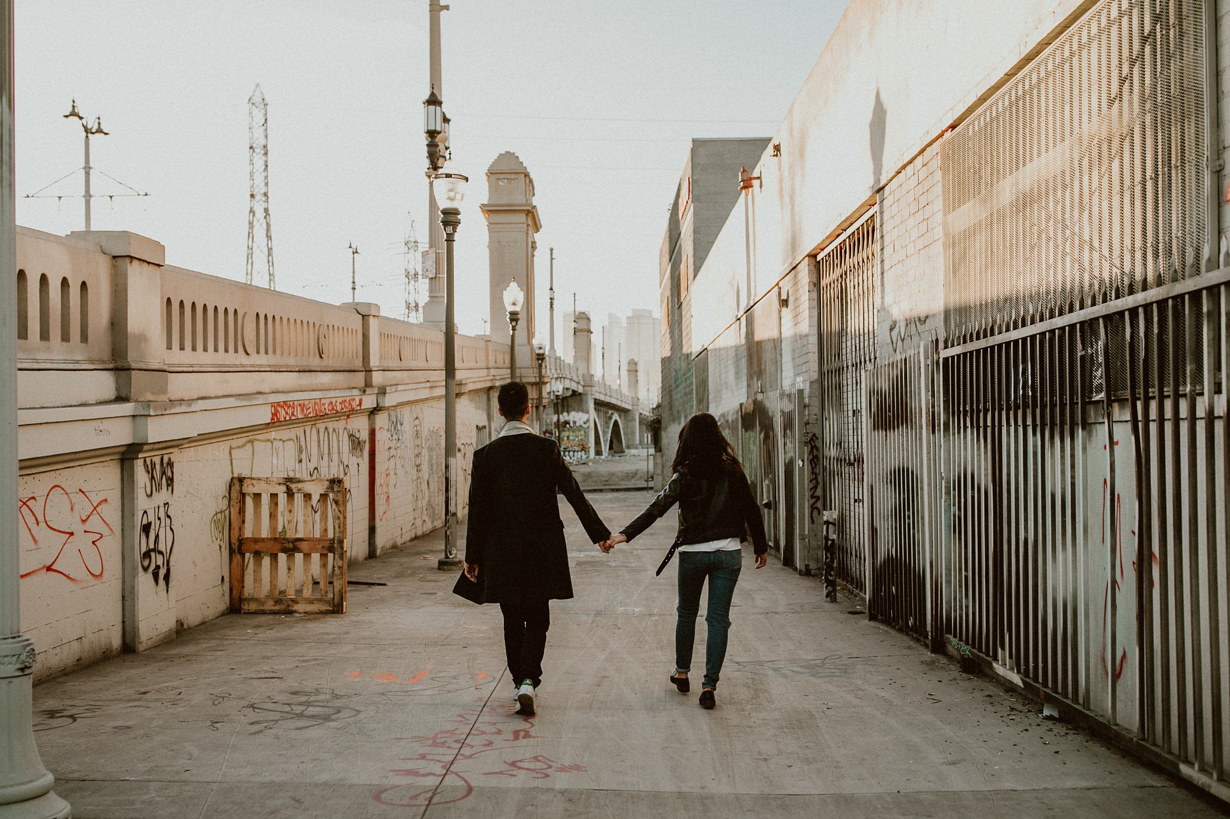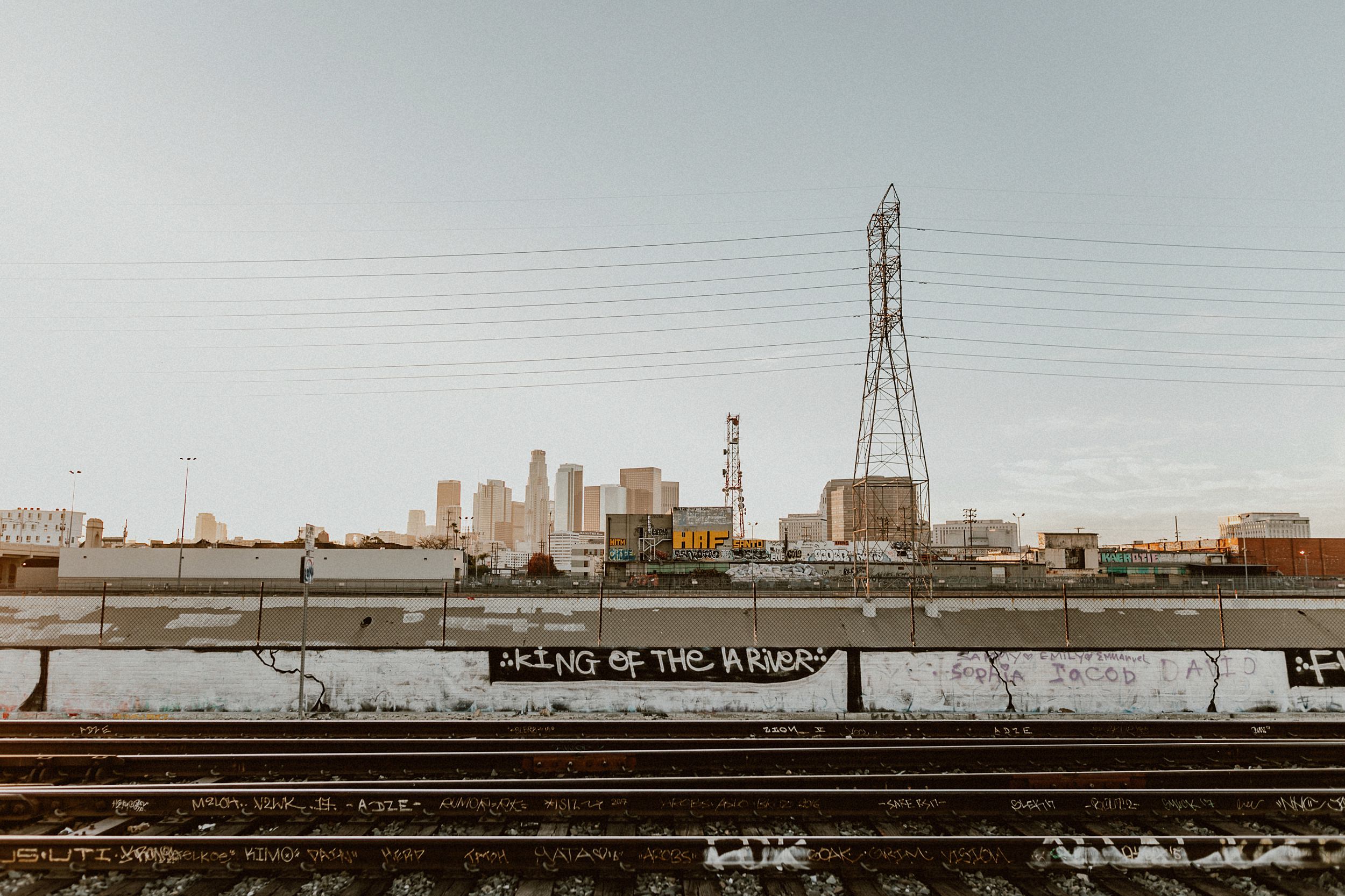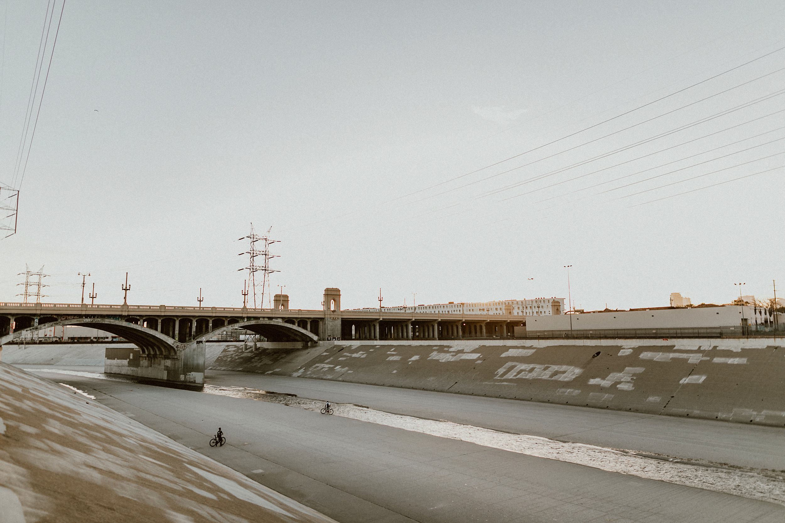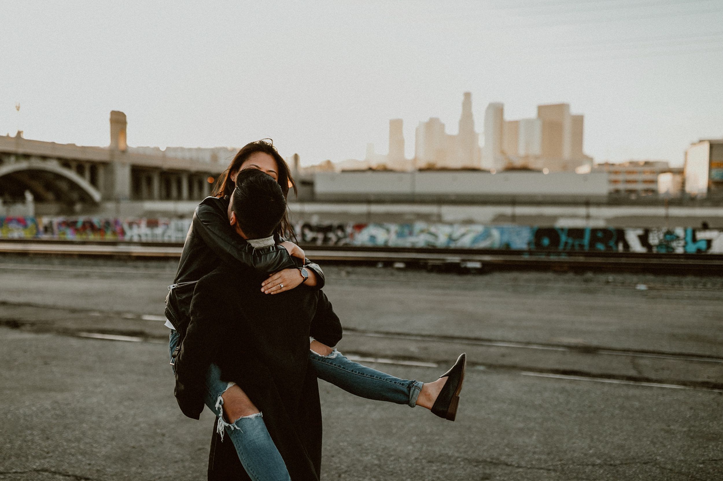 Los Angeles Arts District Couples Photos // We met up with Joanne & George on a rooftop in the middle of Los Angeles. Our game plan was basically to have a playdate on foot throughout the Art’s District. In route, we were seeking all things that give the area character… color and grit, light, architecture, and skylines. Of course, having a couple of babes leading the charge was a little extra something to devour. We were eating up all of Joanne + George’s sweetness the entire time. The endgame? Spilling out into the LA River at sunset. The perfect ending to our little playdate.
