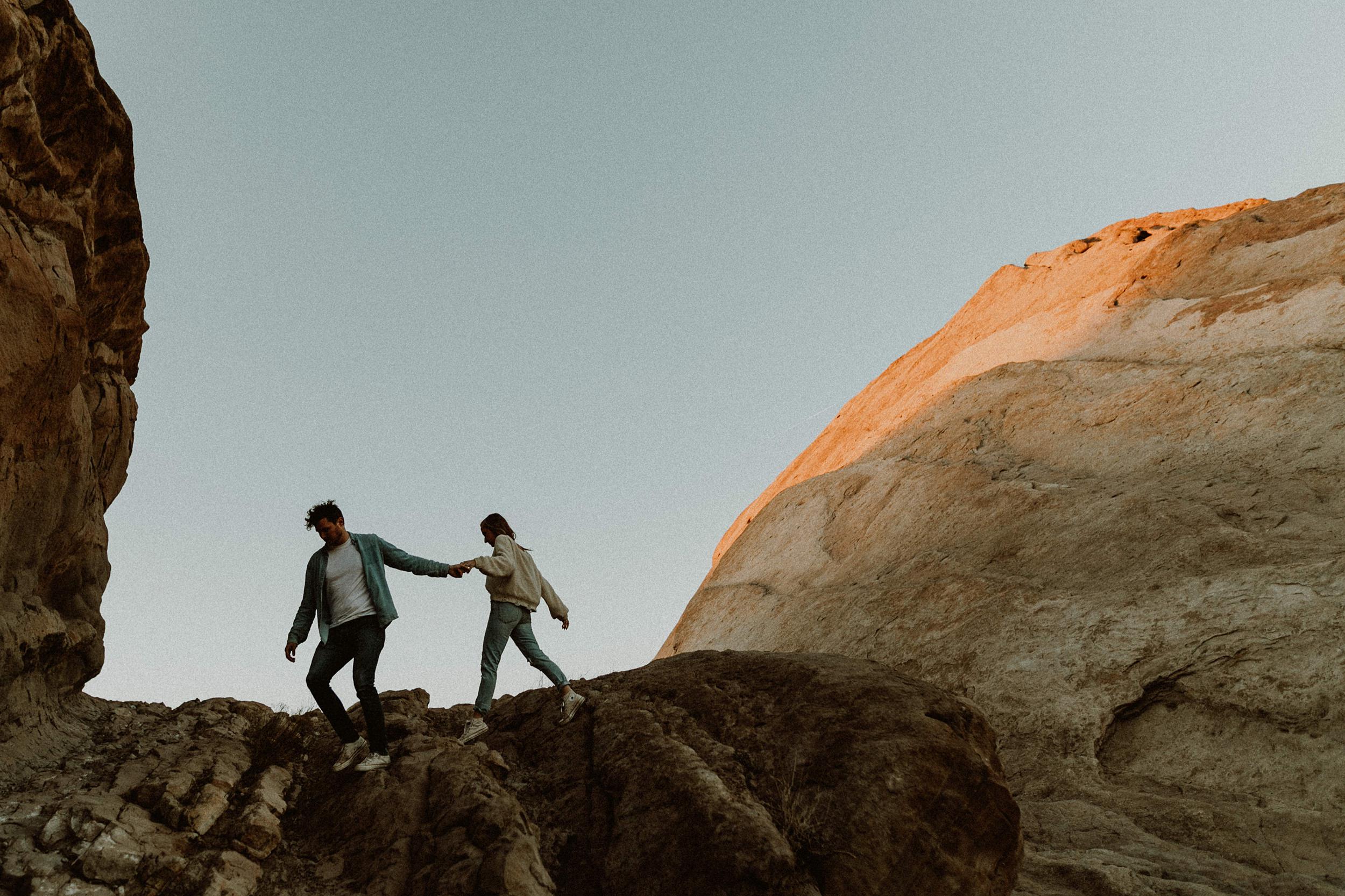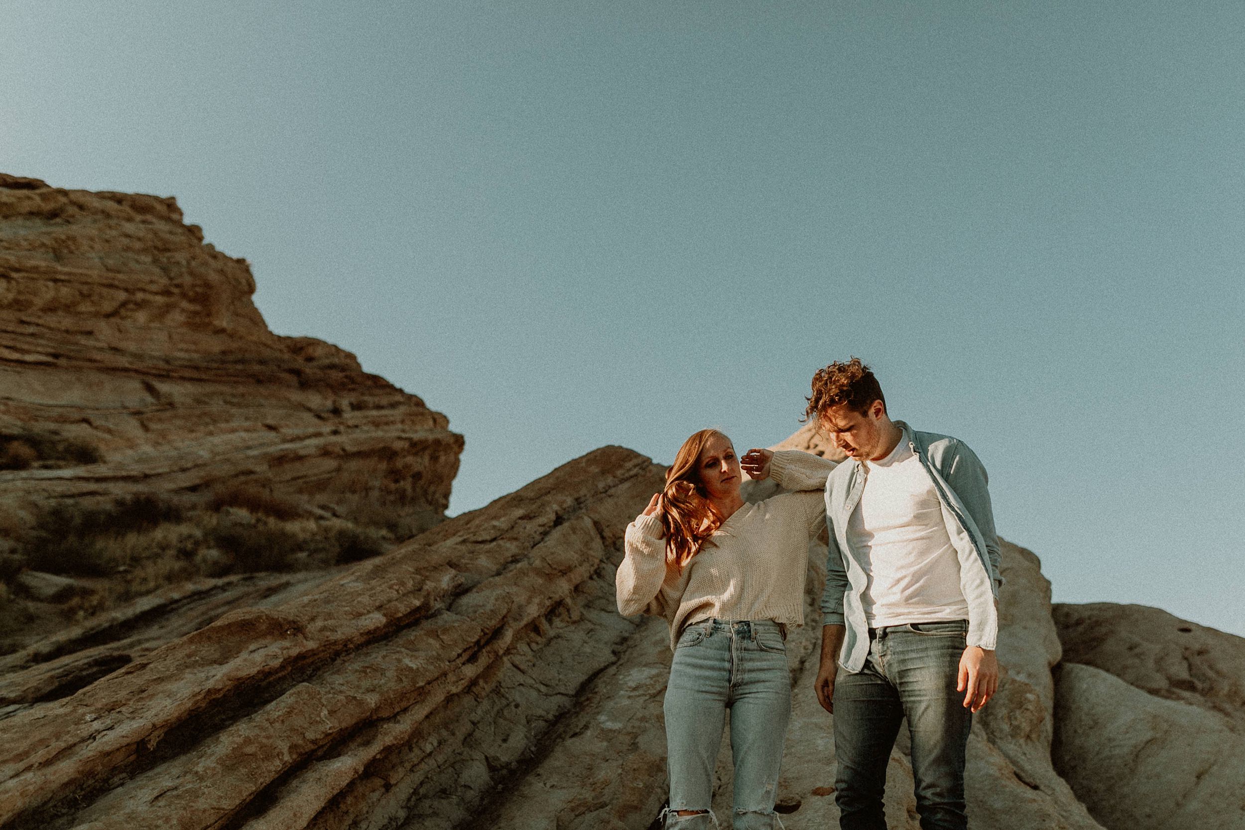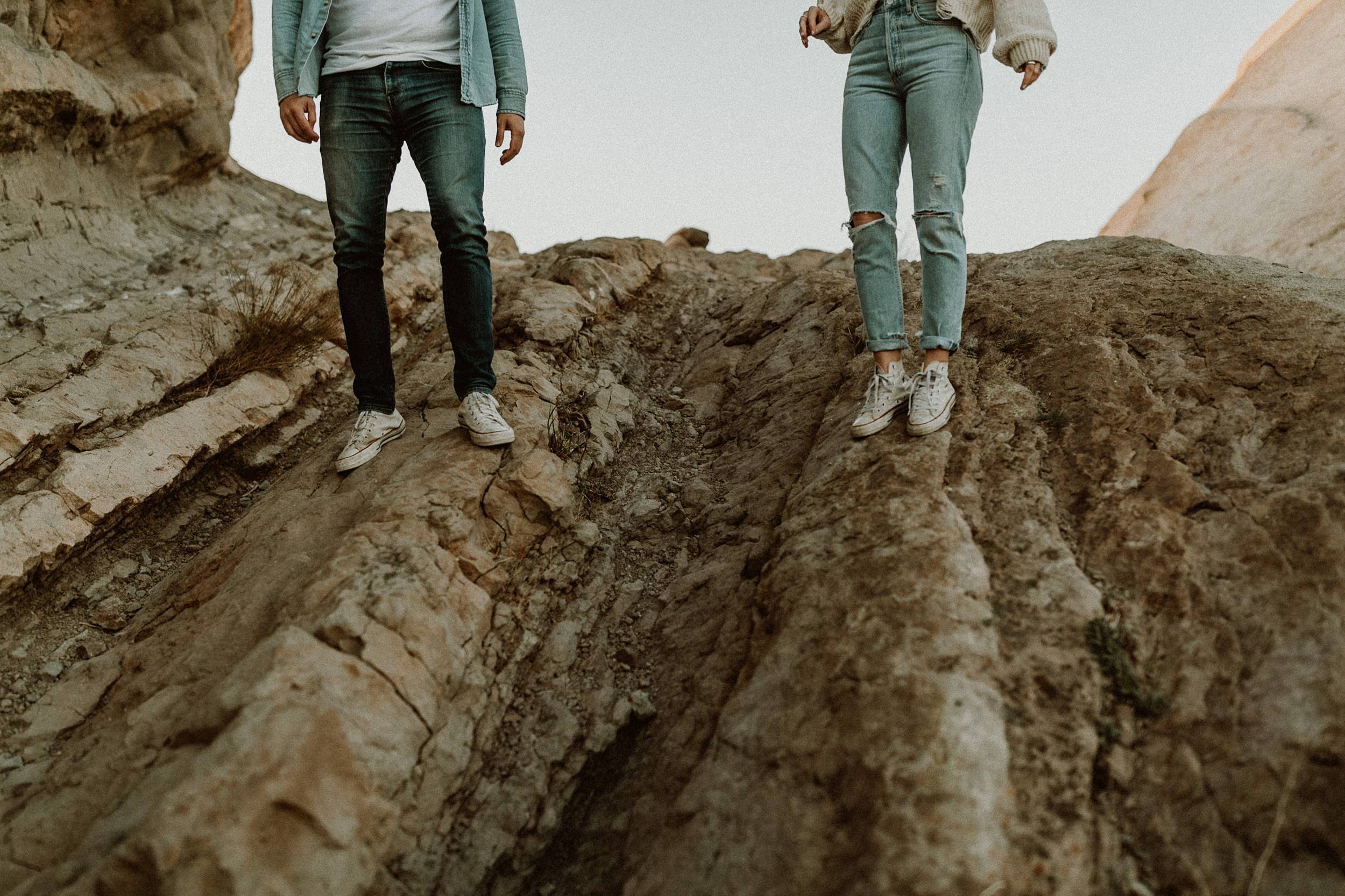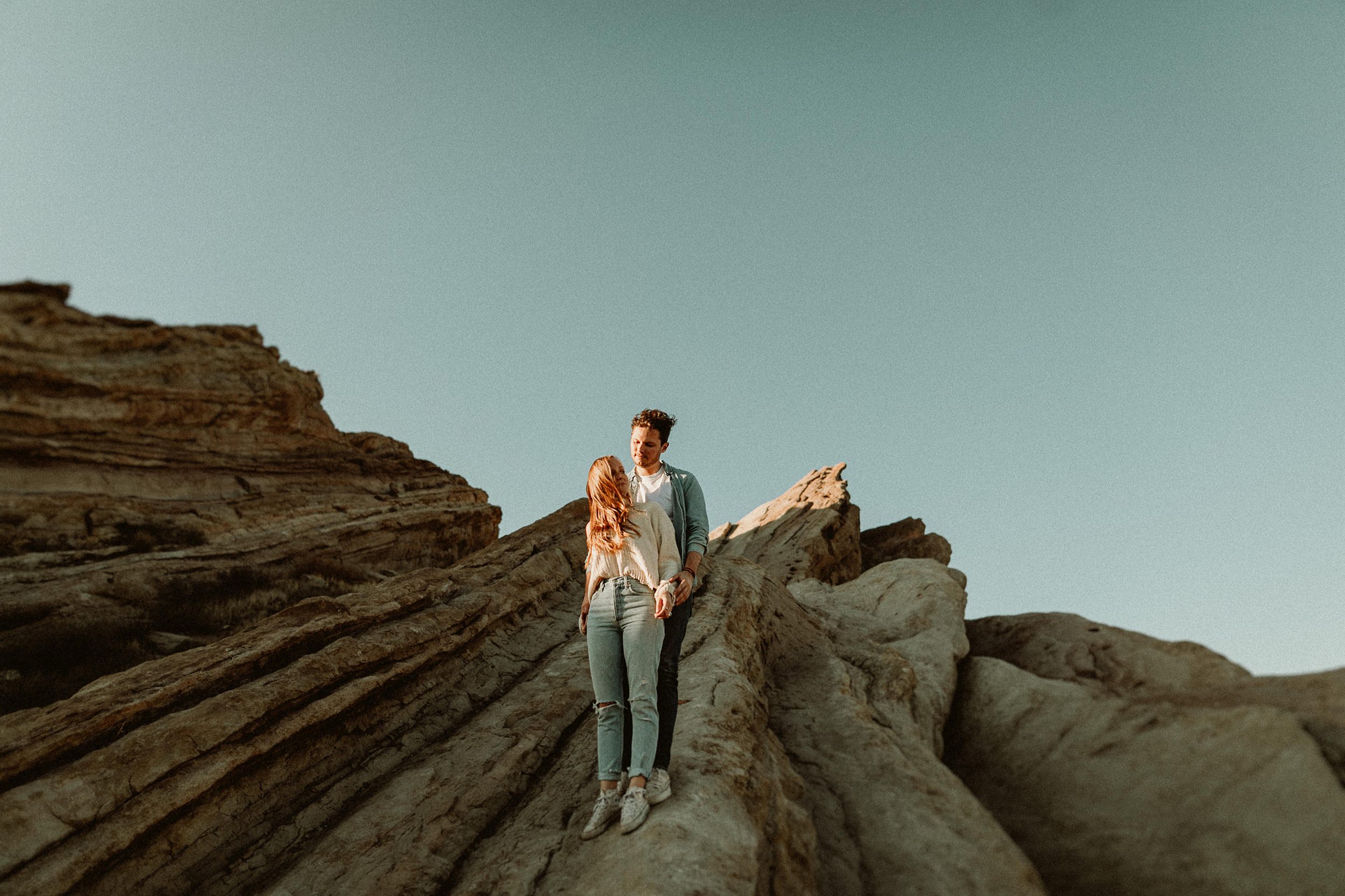 Vasquez Rocks Engagement Photos // This place is unreal. It’s kinda like being on Mars. The story has it that señior Vasquez himself, a legendary bandit in the mid 1800’s, used these geological structures to hideout and evade capture. Jess + Titus wanted to check out this epic landscape for their engagement session location, so we ventured over these wind-swept rock formations together. We hiked up and set our eyes across the jagged valley as I’m sure señior Vasquez did nearly 2 centuries ago. Wild to think about, really, and we can’t wait to return to do it over again.