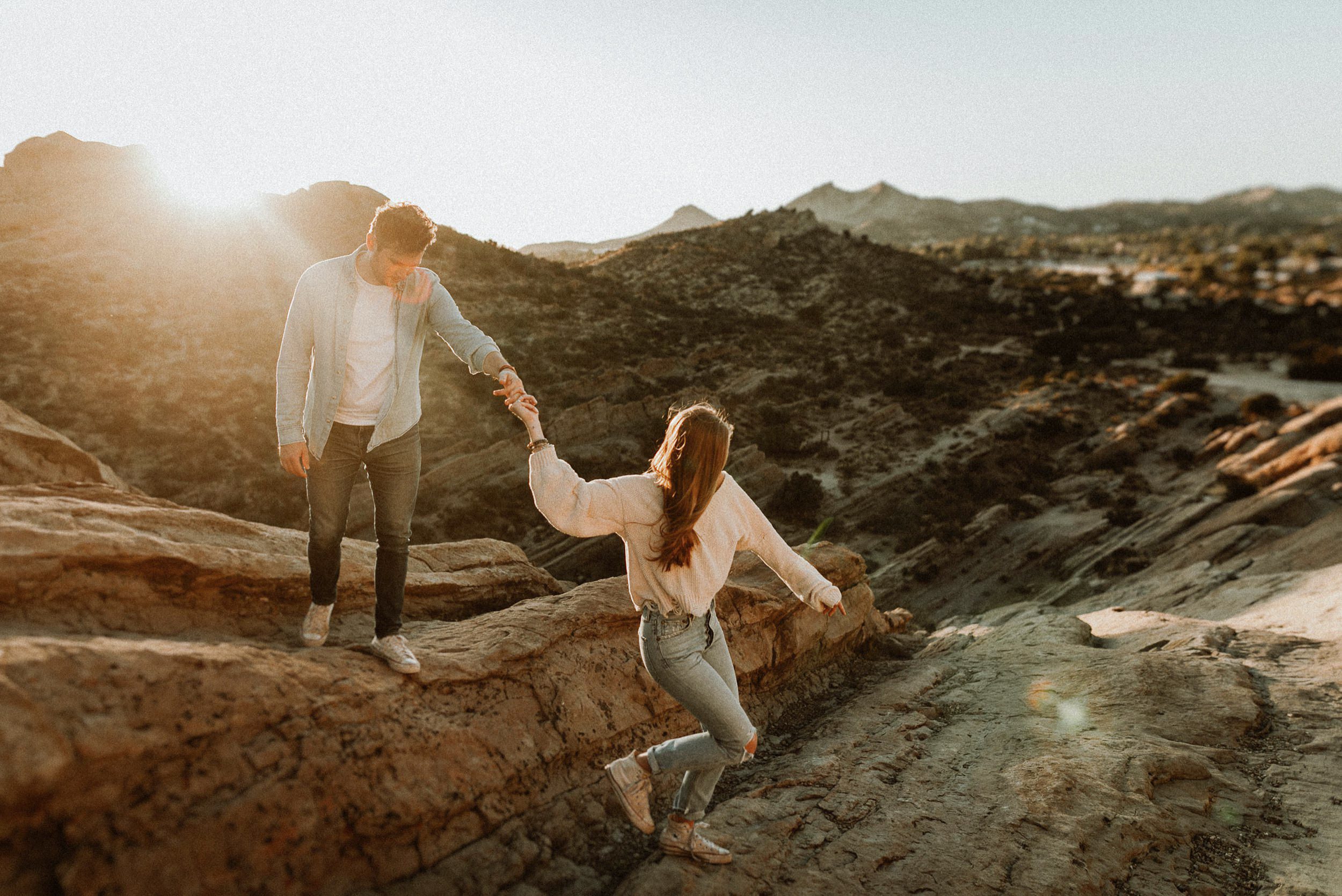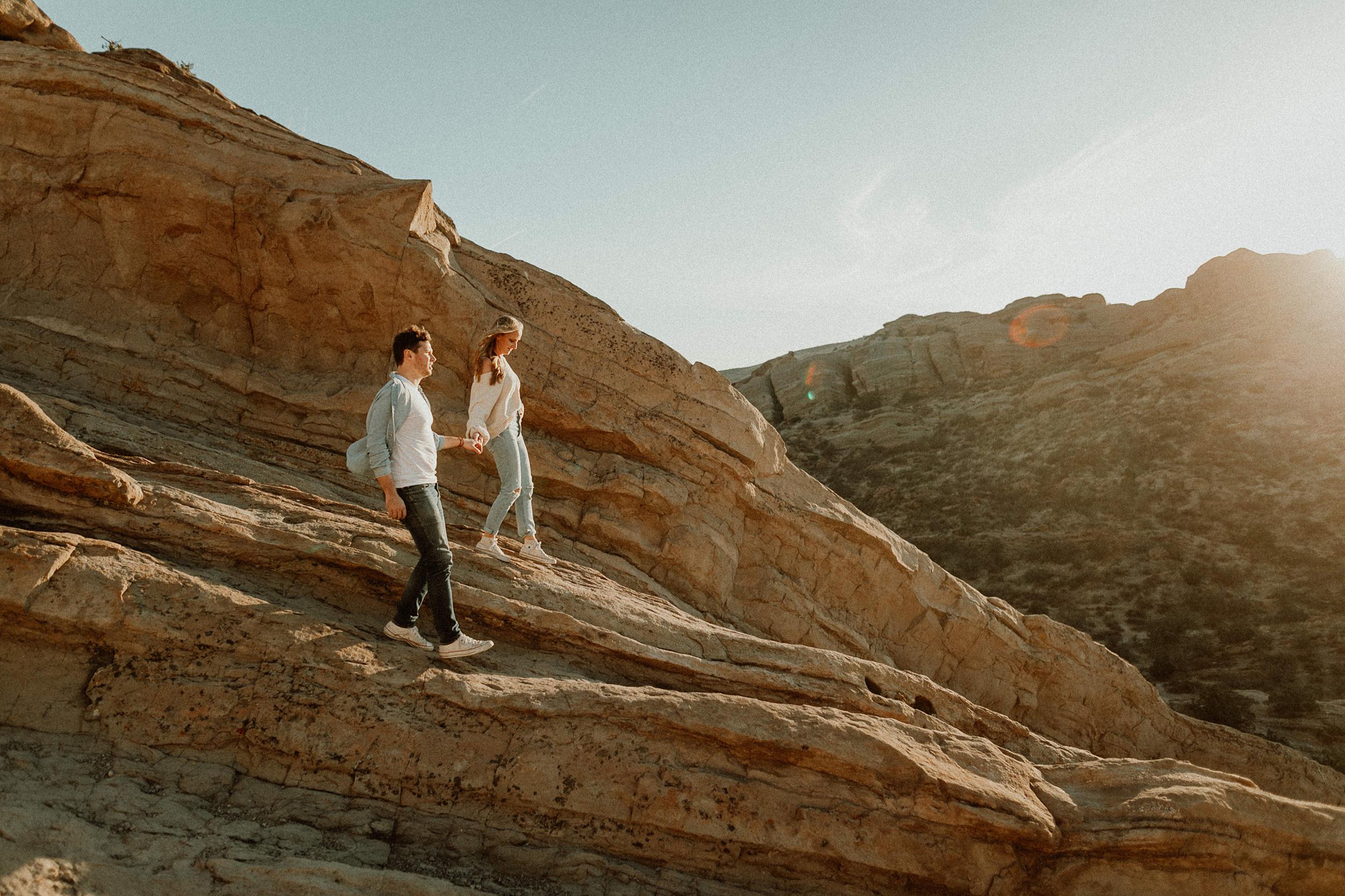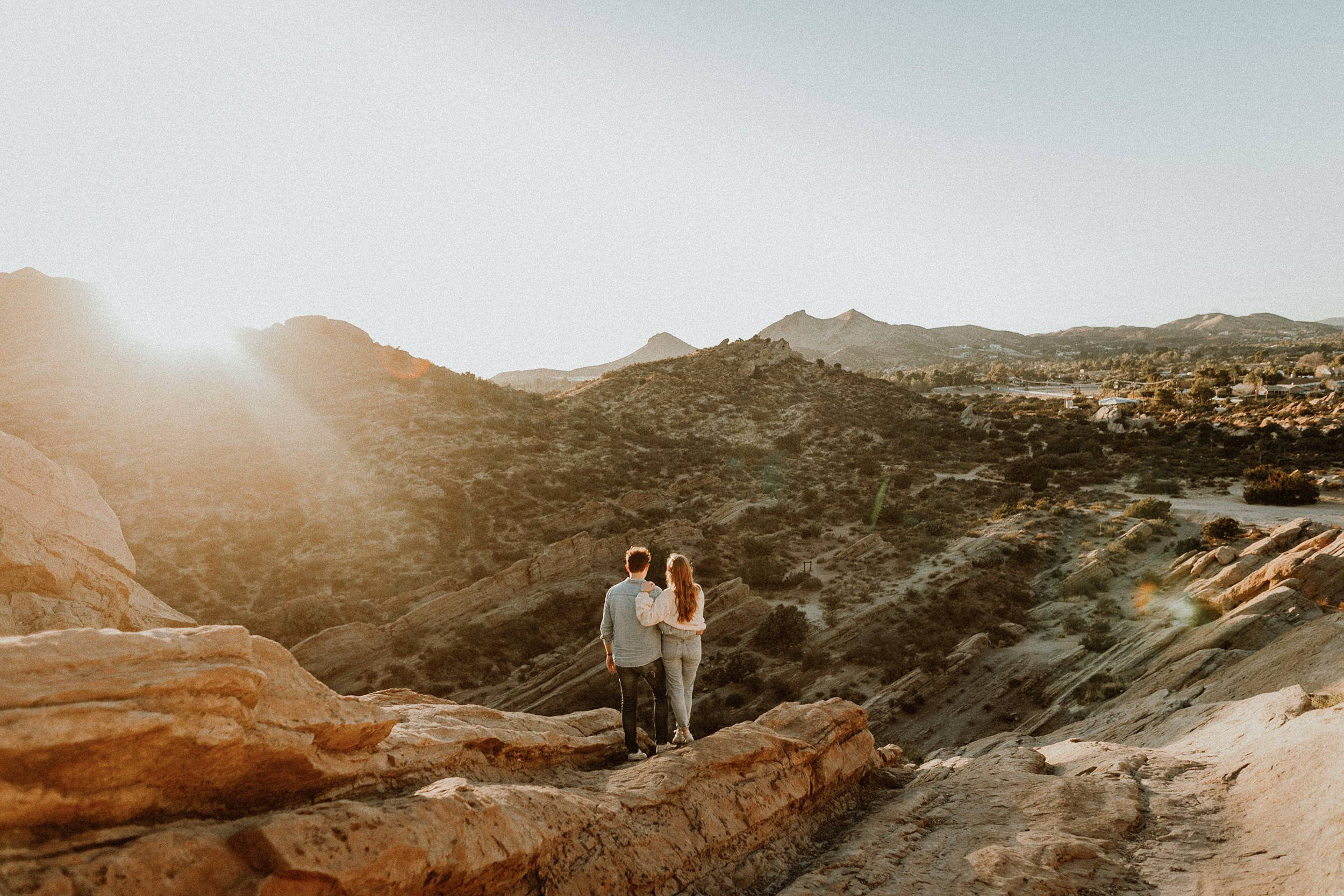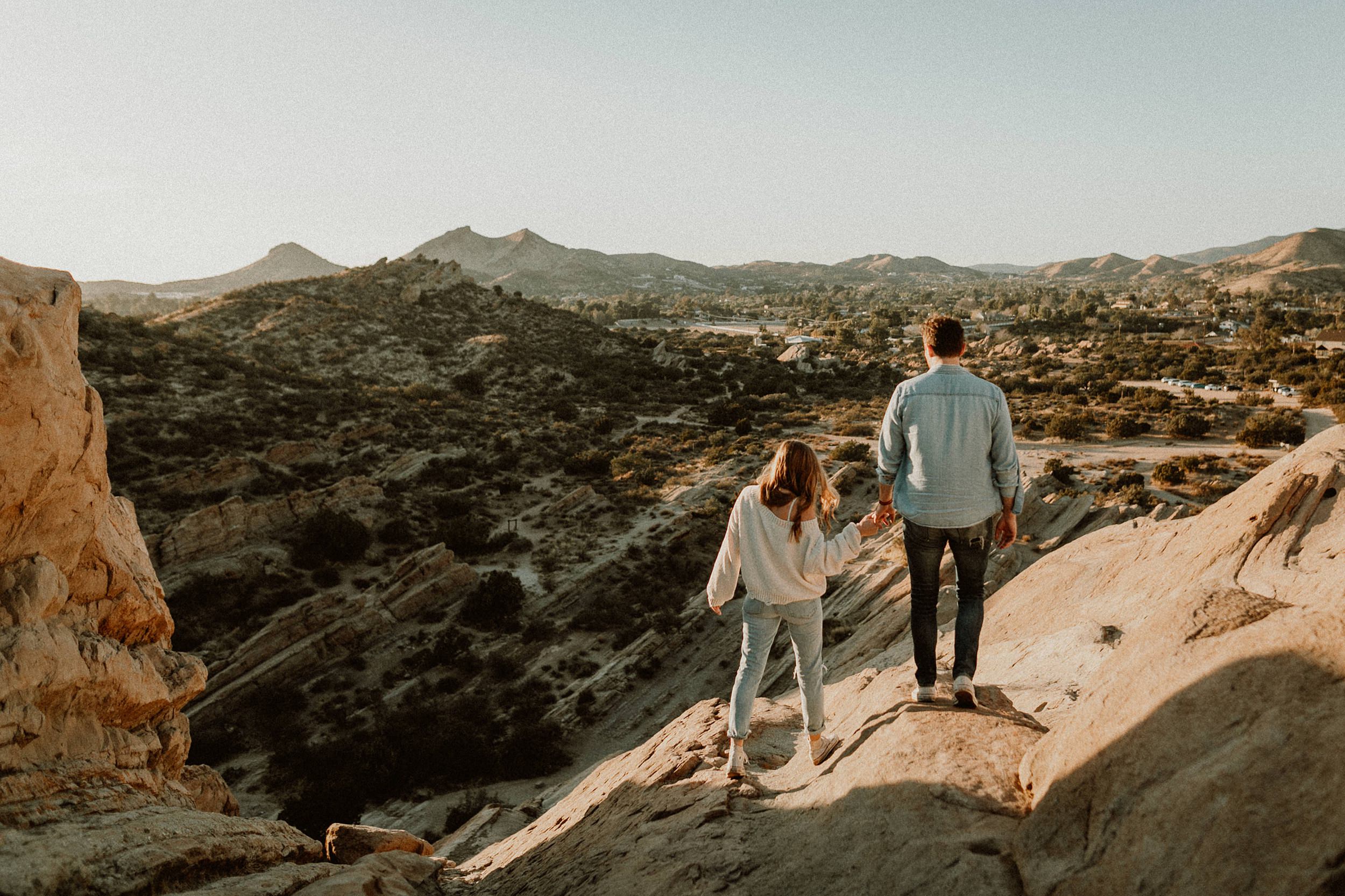 Vasquez Rocks Engagement Photos // This place is unreal. It’s kinda like being on Mars. The story has it that señior Vasquez himself, a legendary bandit in the mid 1800’s, used these geological structures to hideout and evade capture. Jess + Titus wanted to check out this epic landscape for their engagement session location, so we ventured over these wind-swept rock formations together. We hiked up and set our eyes across the jagged valley as I’m sure señior Vasquez did nearly 2 centuries ago. Wild to think about, really, and we can’t wait to return to do it over again.
