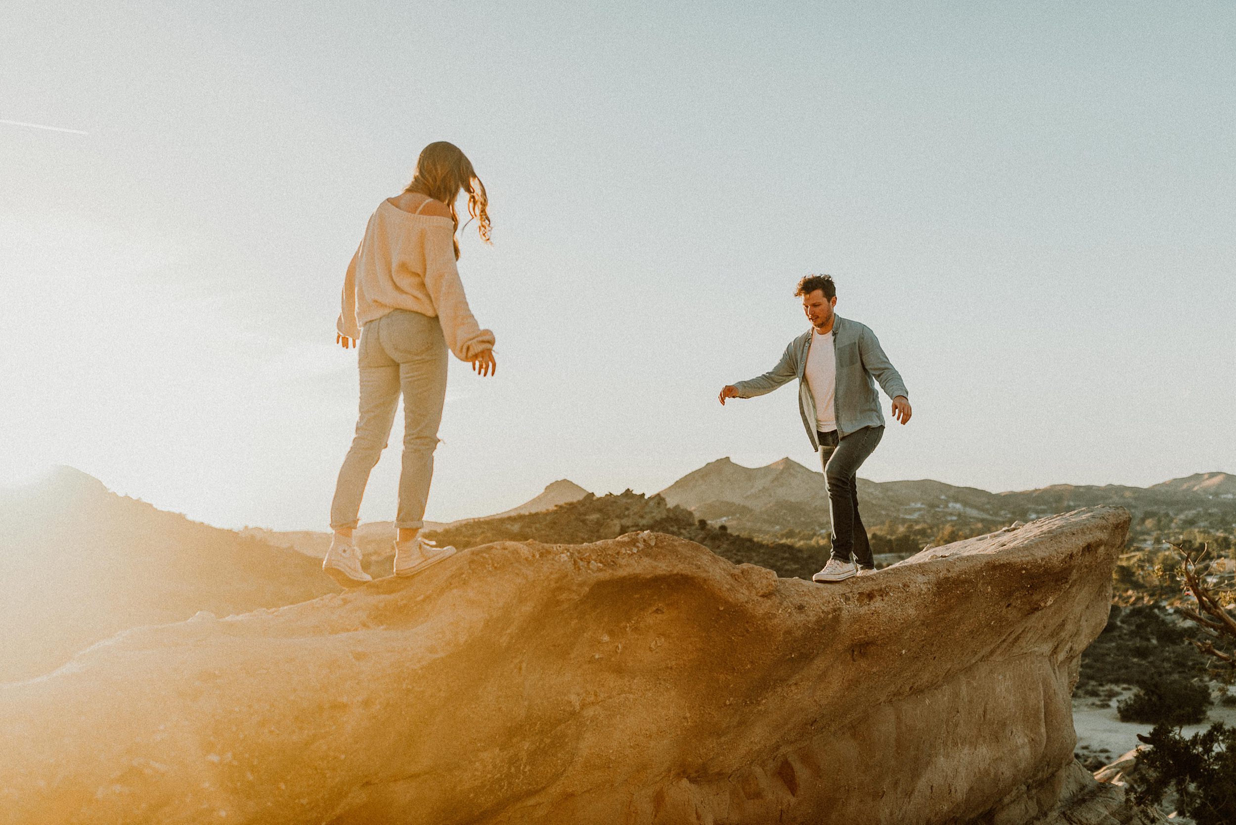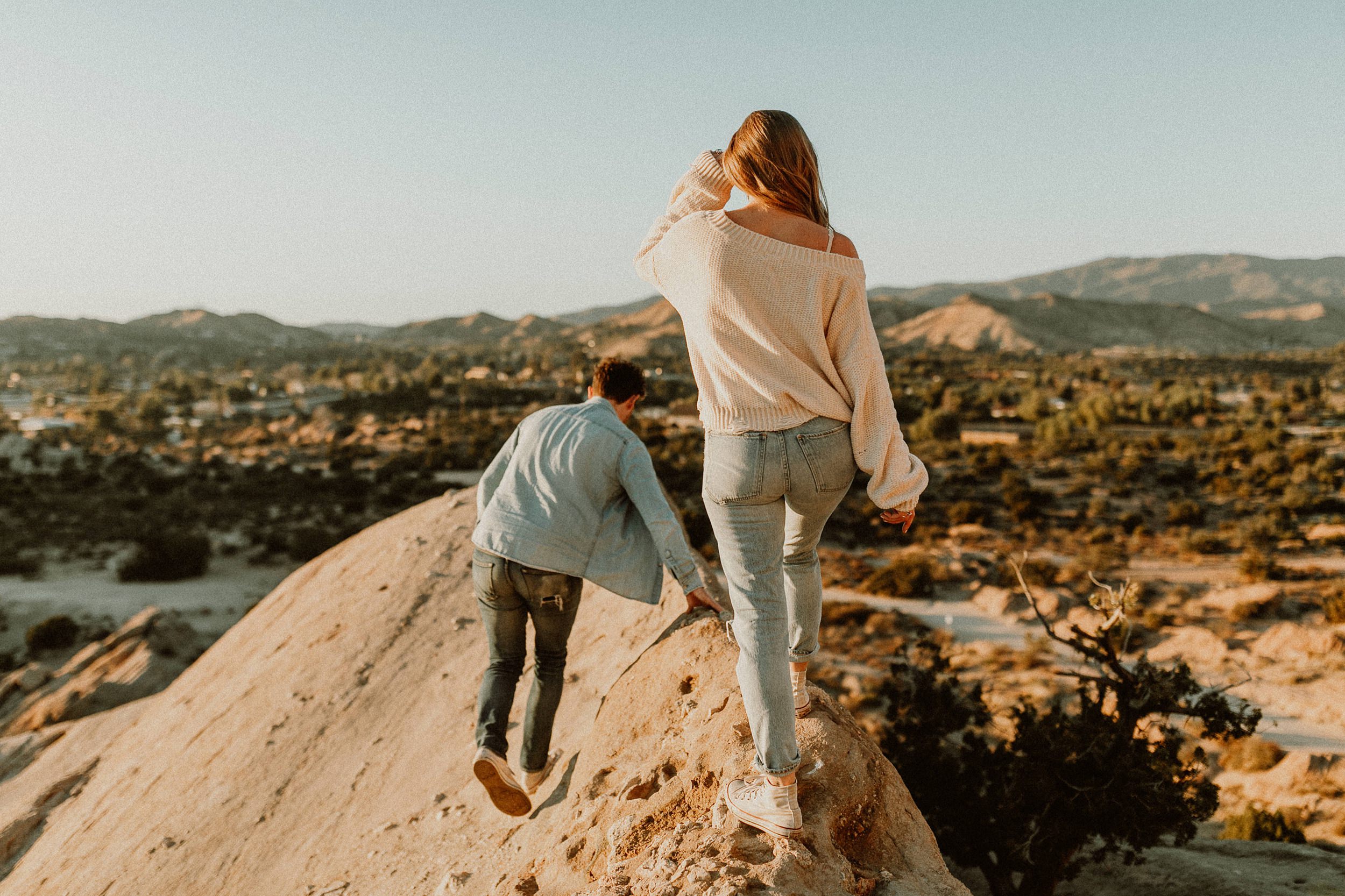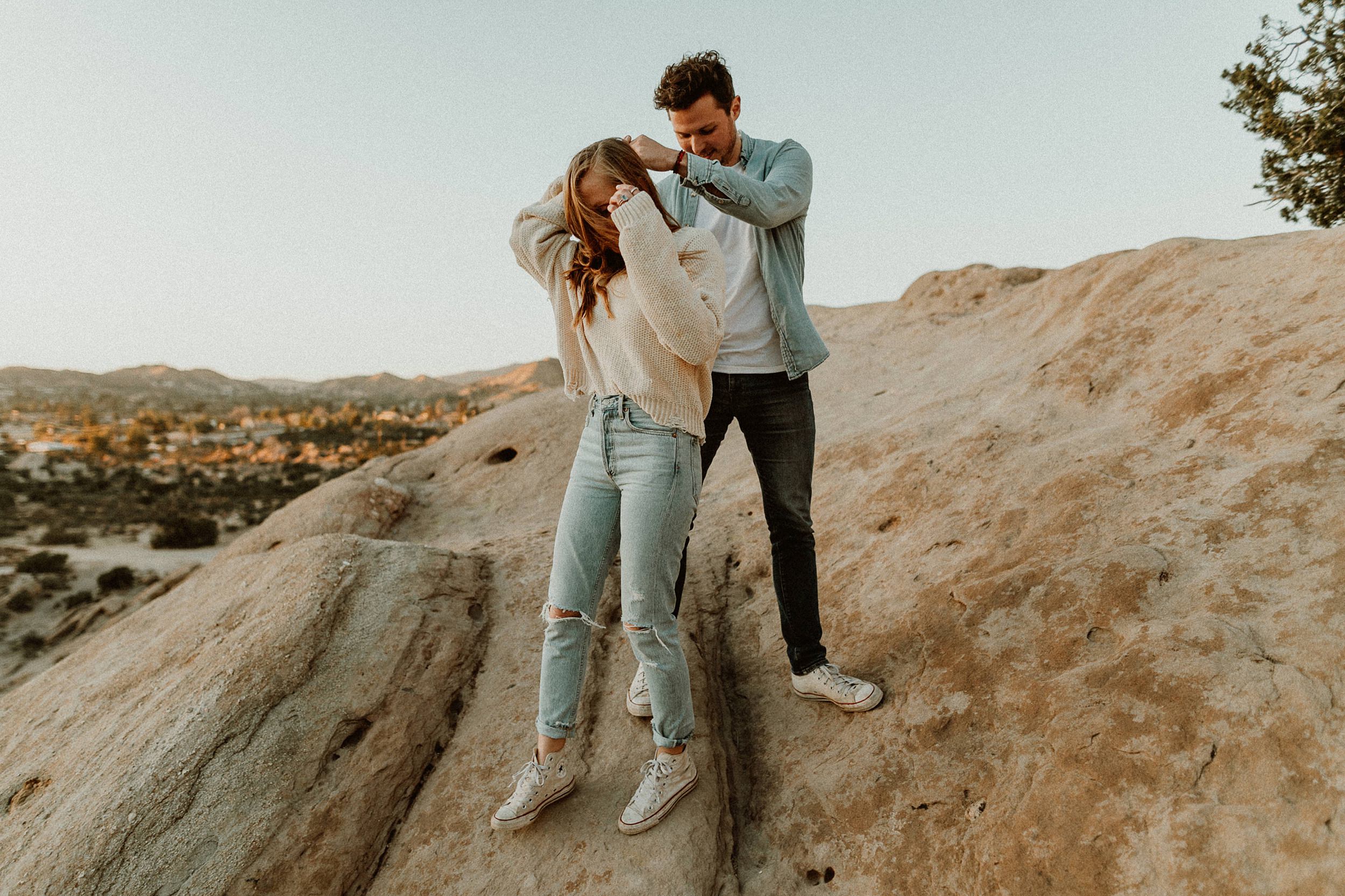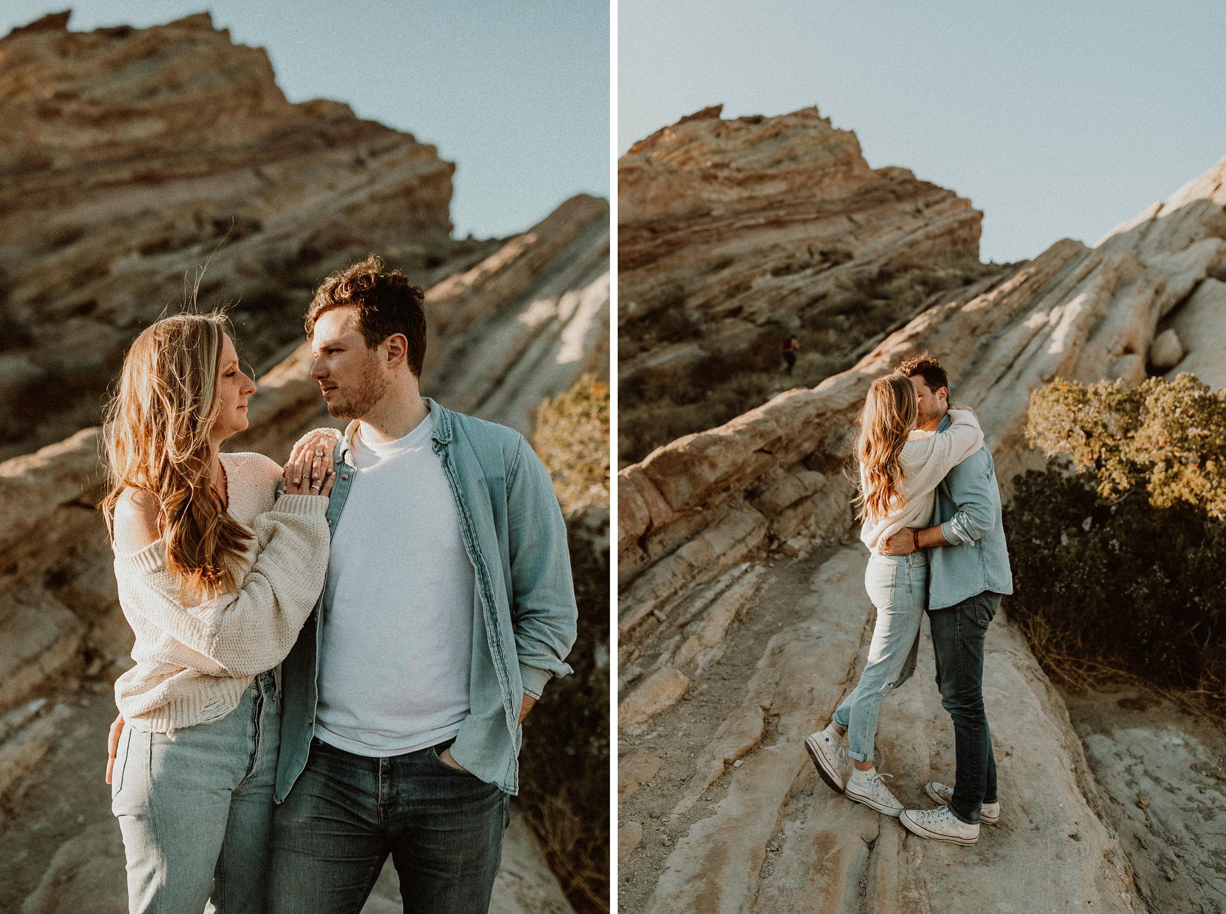 Vasquez Rocks Engagement Photos // This place is unreal. It’s kinda like being on Mars. The story has it that señior Vasquez himself, a legendary bandit in the mid 1800’s, used these geological structures to hideout and evade capture. Jess + Titus wanted to check out this epic landscape for their engagement session location, so we ventured over these wind-swept rock formations together. We hiked up and set our eyes across the jagged valley as I’m sure señior Vasquez did nearly 2 centuries ago. Wild to think about, really, and we can’t wait to return to do it over again.